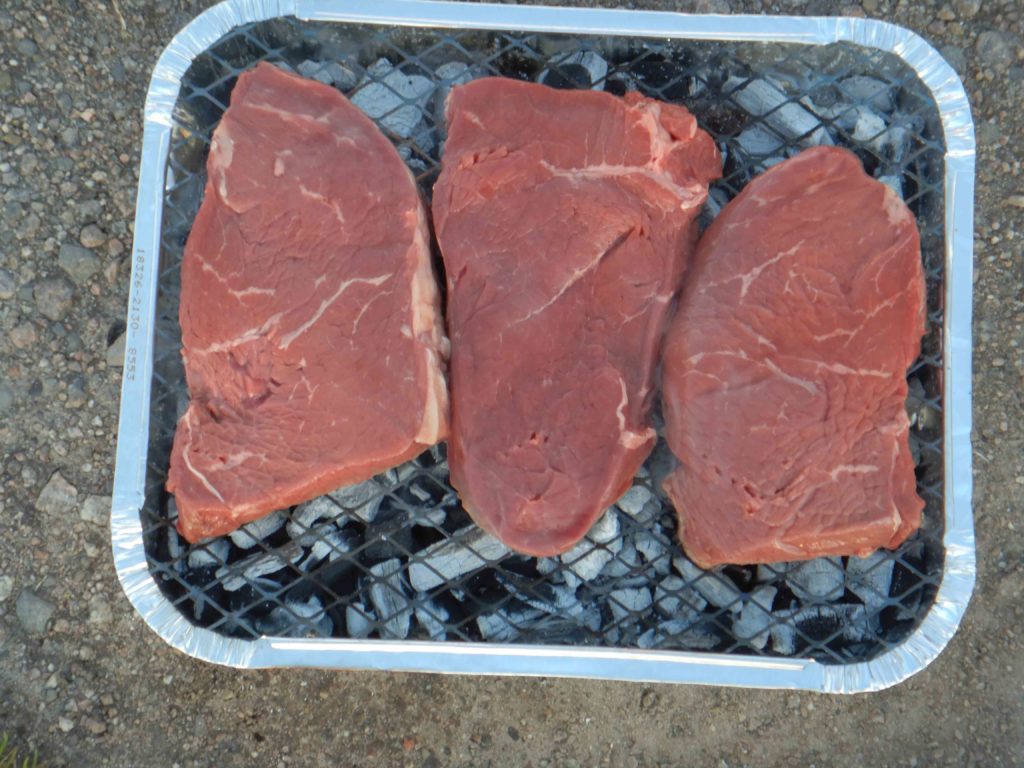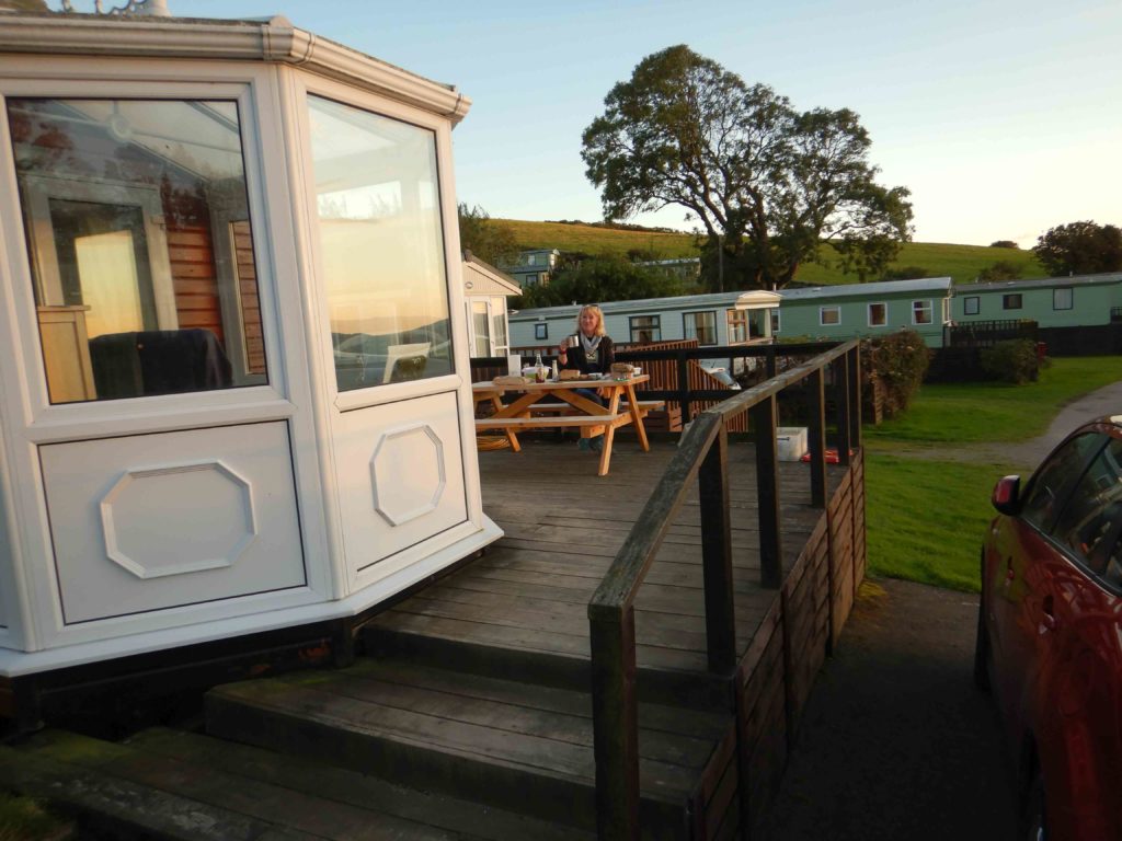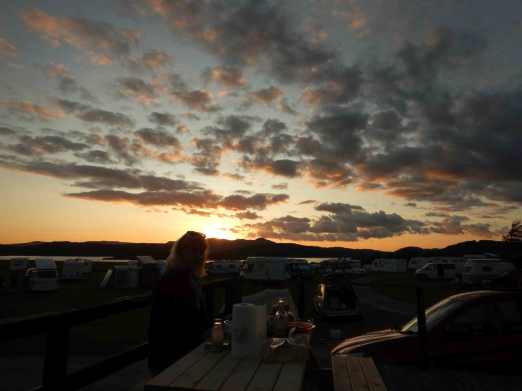 Die restlichen geplanten Punkte sind heute nicht mehr zu schaffen. Also erstmal tanken, und dann bei Tesco für 10 GBP 1kg Steaks, Sättigungsbeilage und etwas Grünzeug einkaufen, bei dem Wetter wird wieder gegrillt. Auf dem Weg zum nächsten Ziel laufen wir einen Campingplatz an, bauen das Zelt auf (kann Karin wirklich super, wenn man sie dabei nicht stört) und schmeissen unsern zweiten geschenkten super-duper-turbo Instantgrill an. Unter den ersten 3 Steaks geht die Kohle erstmal in Deckung und stellt vor Schreck die Arbeit ein. Man muß ihr schon ordentlich Mut zu fächeln, damit sie sich wieder an die Arbeit macht. Nach ca. 30 Minuten sind die ersten beiden Steaks und 4 Würstchen dann so „al dente“ und auch das 3 Steak wird irgendwann noch gut. So wird es doch noch ein schönes Abendessen auf unserer Terrasse bei einem sensationellen Sonnenuntergang.