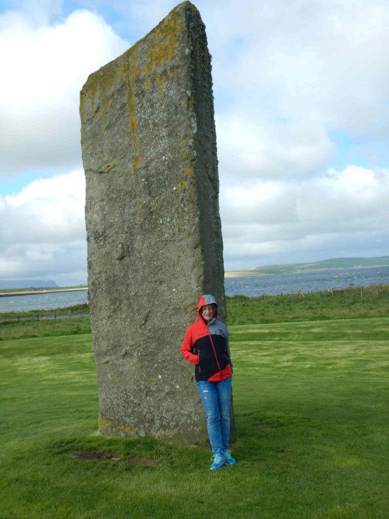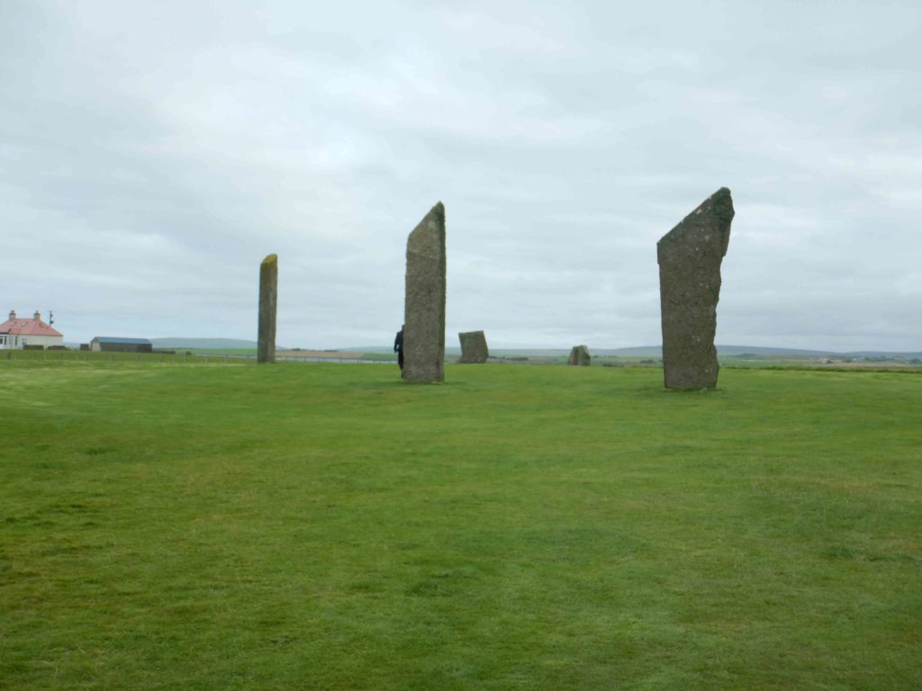 Die Nacht über hat es geregnet, gegen morgen hat es aber aufgehört und es ist nur noch sehr windig. Leider gibt es heute kein Frühstück bei Tesco und nachdem wir Karin einen Kaffee besorgt haben, essen wir im Auto. Wir fahren heute die Sehenswürdigkeiten an der Westküste ab, die alle etwa 5000 Jahre alt sind und beginnen mit den Standing Stones of Stenness und Barnhouse Village. Einem Steinkreis aus mehreren Metern hohen Flagstones und daneben eine Wohnstätte.
