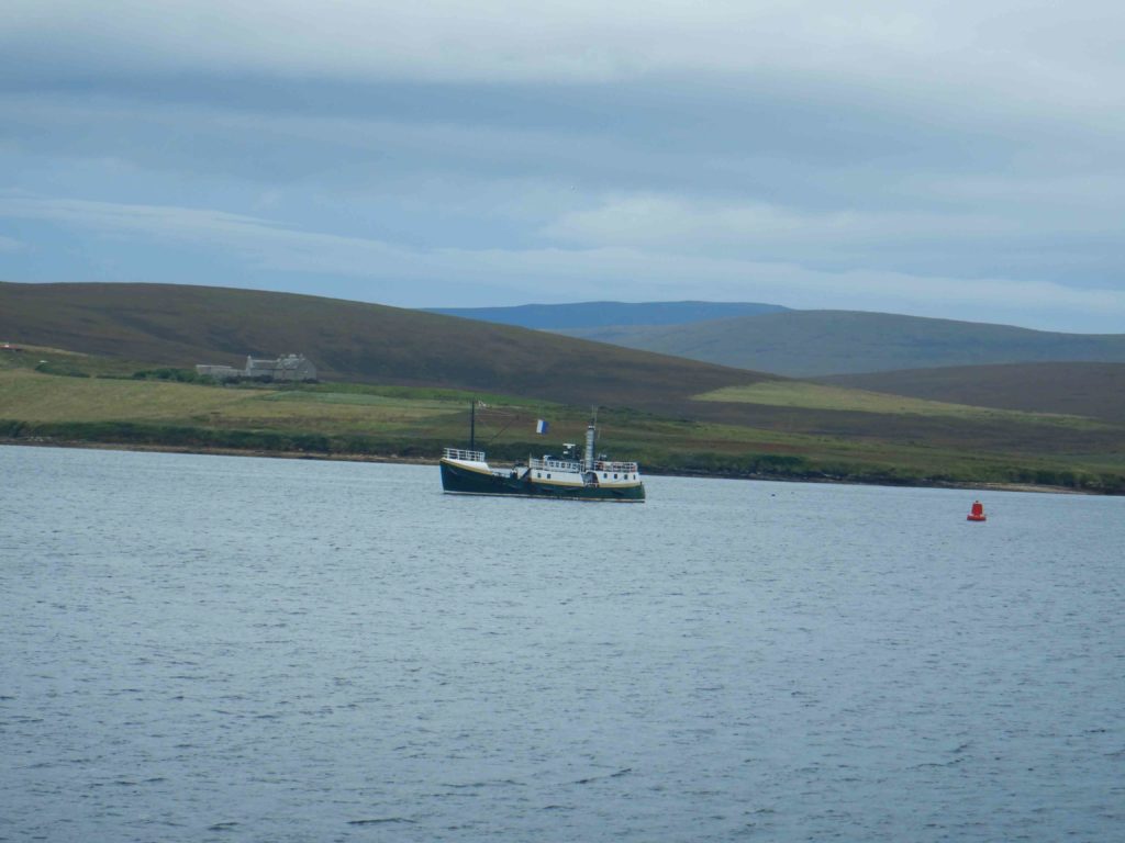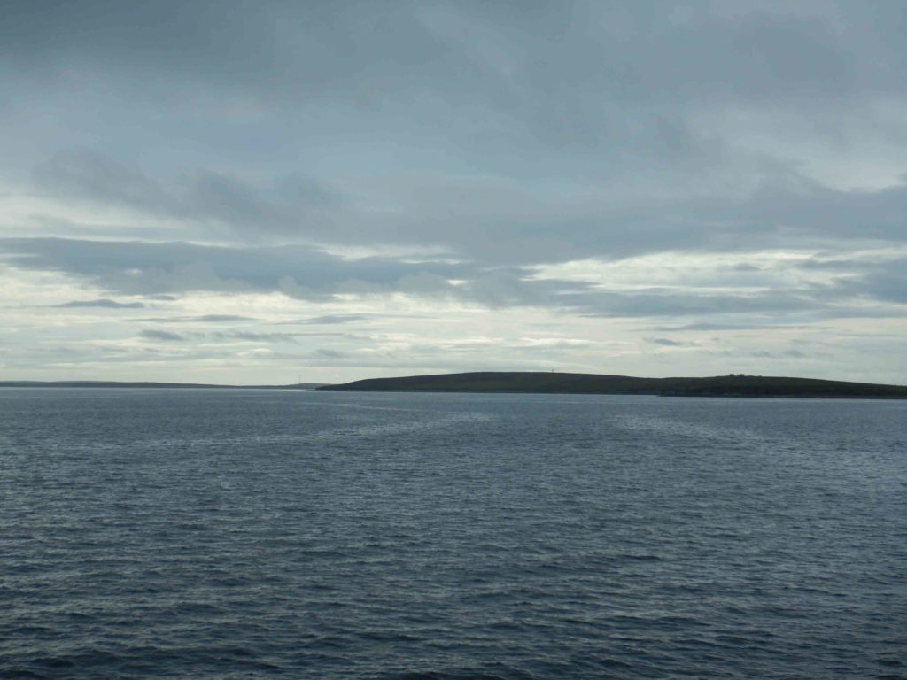 Wir sind gut in der Zeit, frühstücken im Auto und die Überfahrt nach Hoy ist in 35 Minuten erledigt. Dort stellen wir fest, dass das Scapa Flow Visitor Center, Hauptgrund unserer Überfahrt, wegen Renovierungsarbeiten geschlossen ist und es nur eine temporäre Ausstellung gibt. Also schauen wir uns die Aussenanlagen des geschlossenen Centers an und gehen zur Ausstellung. Diese ist ganz interessant und zeigt auf Schautafeln und Bildern die Geschichte während des 1. Weltkieges, als sich dort die deutsche Hochseeflotte nach der Internierung selbst versenkte und während des 2. Weltkieges als dort die britische Home Fleet stationiert war. Da es auf Hoy keine öffentlichen Transportmittel gibt und alle weiteren Sehenswürdigkeiten nicht in vernünftiger Zeit zu erreichen sind, fahren wir mit der nächsten Fähre zurück. Dabei sehen wir ein paar Delphine oder Zwergwale aus der Ferne im Wasser schwimmen.