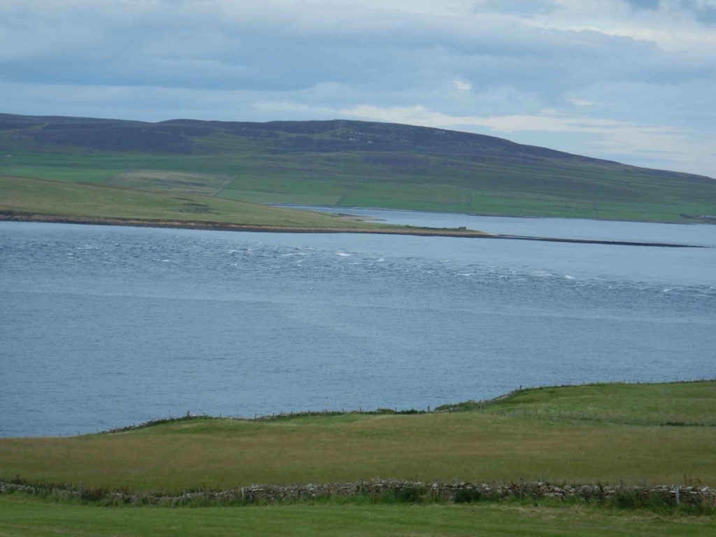 Auf der Weiterfahrt zum Broch of Gurness kommen wir wieder durch die übliche Heidelandschaft mit Rinder- und Schafherden. Interessant ist auf der Fahrt noch eine Meerenge zwischen uns und der Insel Roussay. Das Wasser ist hier so flach das ganz deutliche eine Strömung auf Grund der noch anhaltenden Ebbe im Meer zu sehen ist.