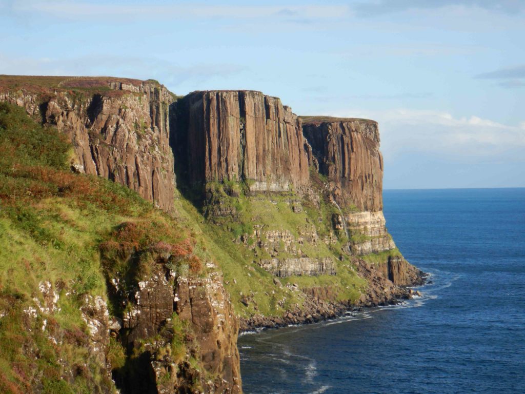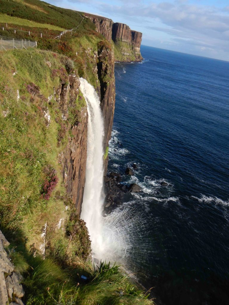 Nach einer stürmischen und regenreichen Nacht wachen wir früh auf und sehen – BLAUEN HIMMEL!!! Völlig berauscht von diesem ungewöhnlichen Phänomen packen wir zusammen und los geht es zum „Kilt Rock“, einer Steinformation an der Ostküste der Insel, die aussieht wie ein Faltenrock oder eben ein Kilt. Genau davor stürzt ein Wasserfall aus den Felsen direkt ins Meer. Super Aussicht von einer riesigen Besucherterrasse, die in Kürze mit mehreren Busladungen von Touristen gefüllt sein wird. Doch Morgens um halb neun ist es ruhig und leer.