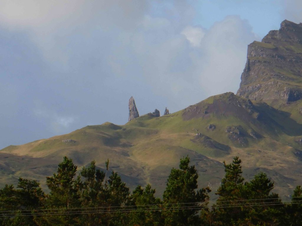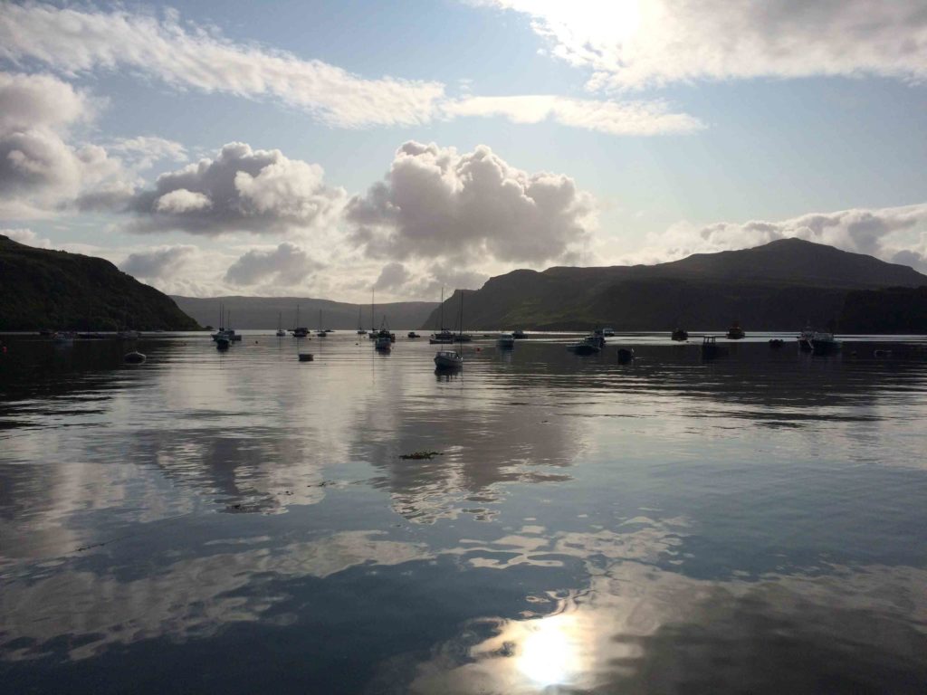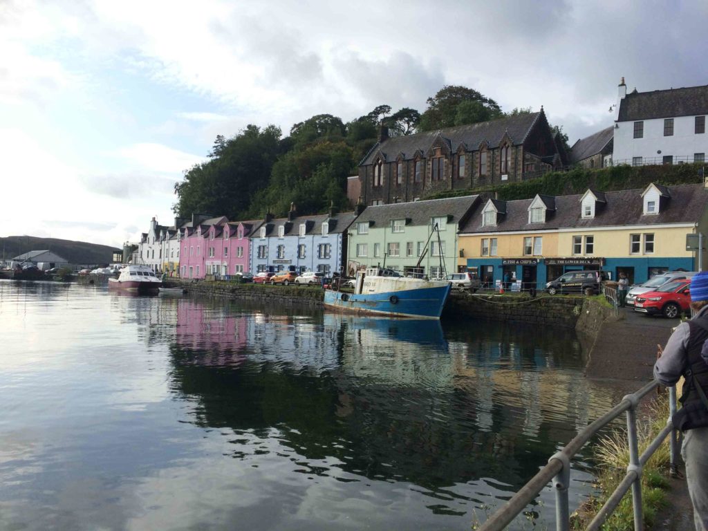 Weiter geht es zum „The Storr“, eine imposante Felsnadel, die oberhalb der Straße in den Himmel ragt. Die Wanderung dorthin lassen wir wegen des aufgeweichten Bodens besser sein. Im niedlichen Hafenstädtchen Portree machen wir halt, um die schöne Hafenpromenade entlang zu spazieren, und frühstücken mit toller Aussicht auf den Hafen.