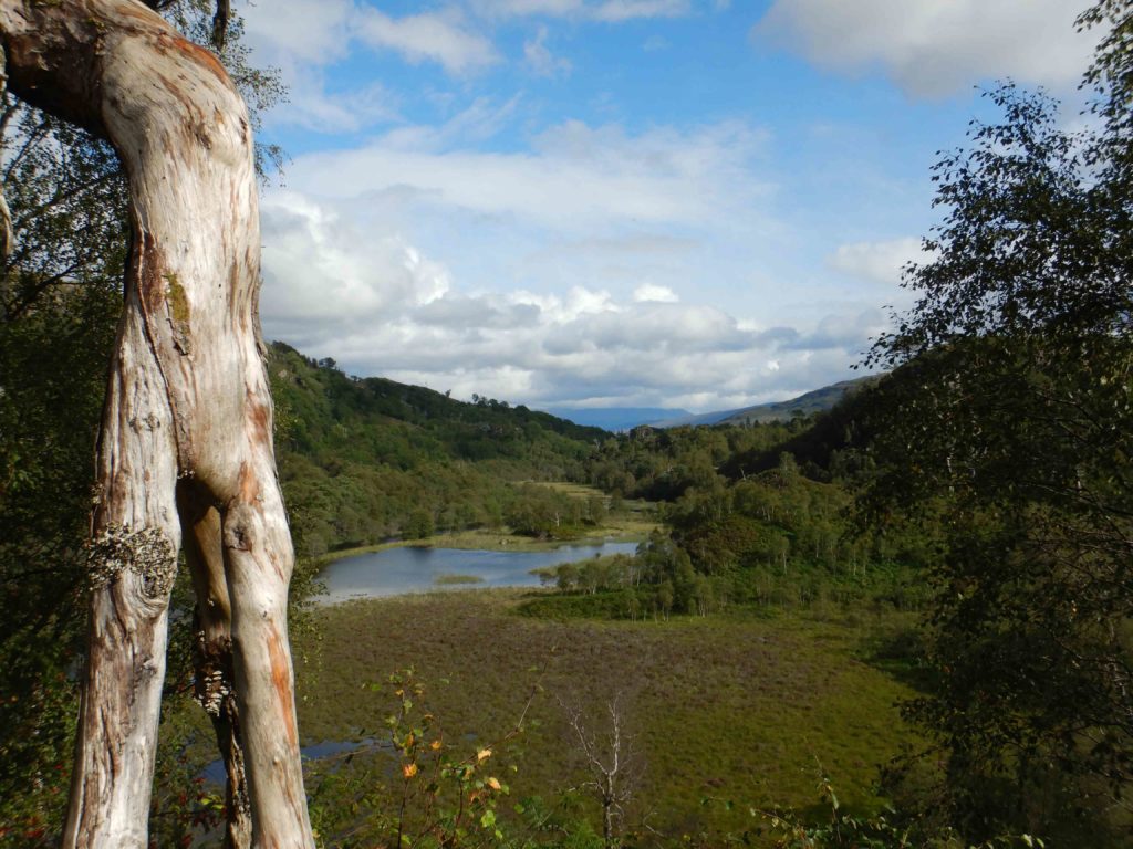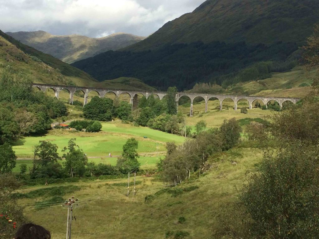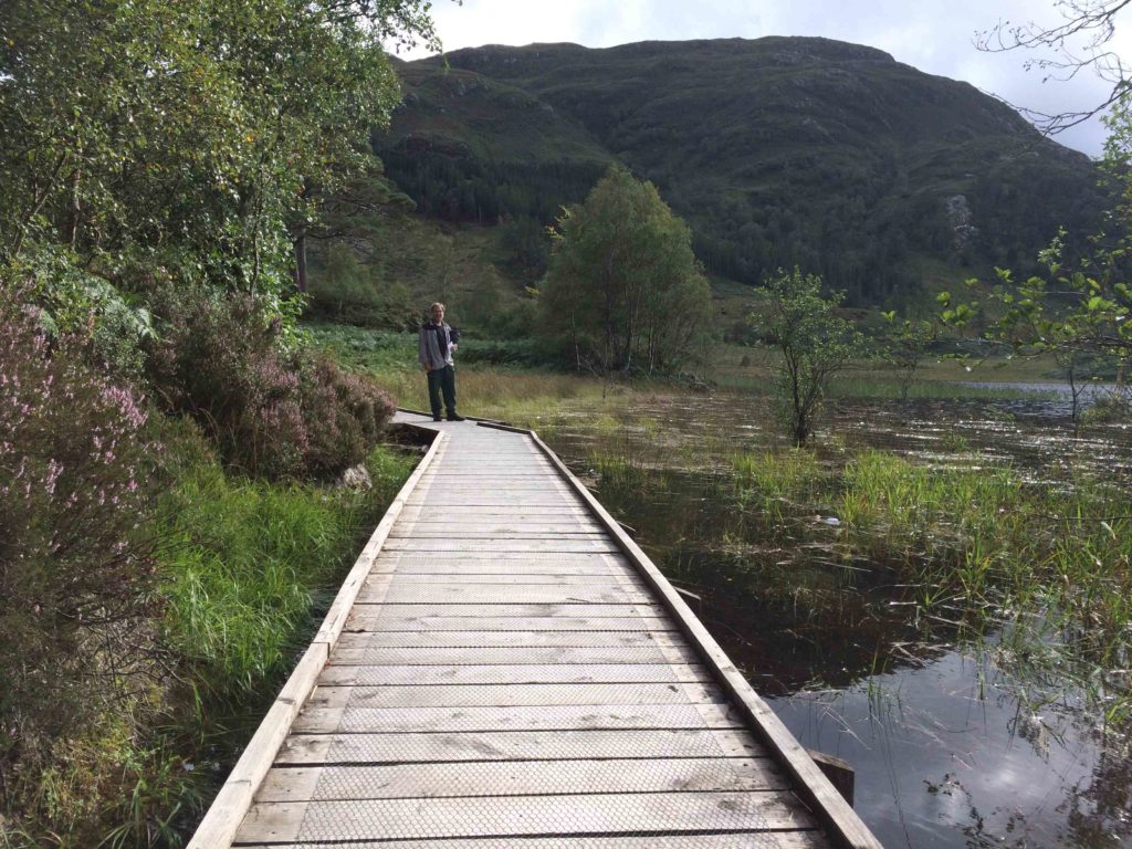 Hier ist der Parkplatz bereits wegen Überfüllung geschlossen, und wir parken etwas entfernt auf einem Waldweg. Da wir nicht wie die Anderen den matschigen Straßenrand entlang stapfen wollen, findet Schlossi zufällig einen sehr schönen Wanderpfad, der sowohl zum Monument, als auch zu einigen schönen Aussichtspunkten führt. Das Monument direkt am Loch Shiel und das zugehörige Besucherzentrum ist nicht die einzige Attraktion hier, direkt hinter dem Haus geht es den Berg hinauf. Von dort hat man einen guten Blick auf das Viadukt, über das der Harry Potter Zug fährt.