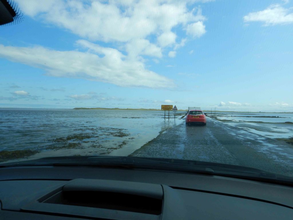 Es sind bis Edinburgh ca. 200km zu fahren. „Wir“ haben einen prima Plan und wollen nach Vorschlag vom Reiseführer in Dunbar Mittag machen. Auf der Strecke sehe ich dann ein Schild nach Lindisfarne und mir kommen die Geschichten von den Wikingern in den Kopf, die dort erstmals die englische Küste überfallen haben sollen. Also biege ich kurz entschlossen ab, keine Ahnung was uns erwartet. Prompt stehen wir auf der kleinen Seitenstraße nach ein paar Kilometern, Entschuldigung, natürlich Meilen, im Stau. Nach einigen Minuten im analogen Leben und etlichen Wischis im digitalen ist der Grund klar: Die betreffende Insel ist nur bei Ebbe über einen ansonsten gefluteten Damm zu erreichen. Wir haben genau den richtigen Zeitpunkt erwischt und das letzte Wasser fließt gerade ab. Wir kommen also nach ca. 10 Minuten als eines der ersten Fahrzeuge auf die Insel. Das nenne ich perfektes Timing. Geparkt, die Räder klar gemacht und wir gehen auf Inseltour.