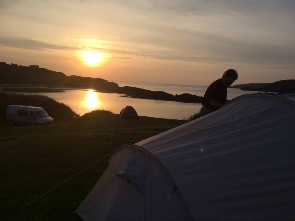 Unser Endziel für heute ist der Campingplatz in Scourie, wo wir gegen 17.30Uhr ankommen und einen Platz mit grandiosem Ausblick beziehen. Es ist immer noch Bombenwetter und nahezu windstill. Auf den Kocher machen wir uns was zum Essen und schauen dabei über die Bucht vor uns. In der Nacht frischt der Wind stark auf und rüttelt ordentlich an unserm Zelt, wir stehen halt auch recht exponiert.