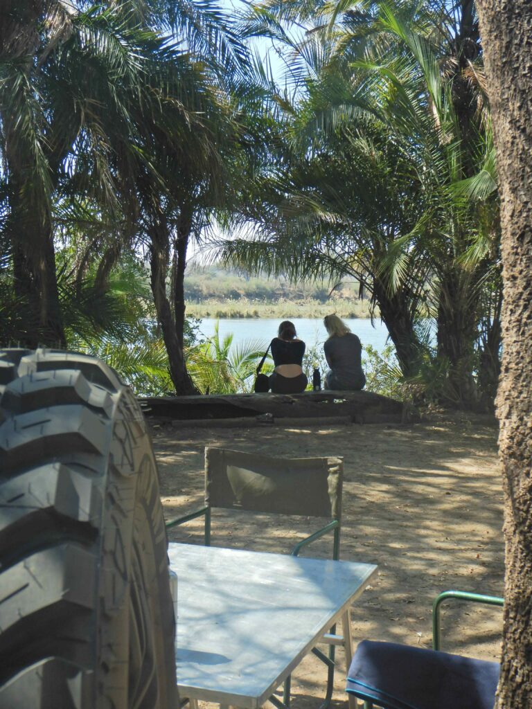 Nach dem Einkaufen und Geld tauschen (das dauert fast 1 Stunde) geht es weiter auf der C42 nach Grootfontein. Wir finden direkt an der Hauptstraße eine Einheimische mit Grillstand (der besteht aus einer Autofelge für die Glut und einer Fahrradfelge mit Drahtgitter als Grillrost) und halten auf meinen ausdrücklichen Befehl sofort an, es ist Mittagspause. Wir bekommen verschiedene Fleischstücke, die sehen aus wie Schweinebauch und Rindfleisch, gegrillt und gut gewürzt. Dazu eine Salsa aus Tomaten und Zwiebeln, und Katrin nimmt noch den üblichen Maisbrei auf den Teller. Wir nehmen unsere Beute mit ins Auto und essen dann auf einem Rastplatz an der Straße, im Ort selbst an der Hauptstraße das Auto ausräumen, um an Geschirr und so weiter zu kommen scheint uns doch zu unsicher. Obwohl es positiv auffällt, daß wir von den durchaus vorhandenen Müssiggängern weder angesprochen noch sonst wie genervt werden. Das Esssen schmeckt uns eigentlich gut, nur das Rindfleisch erfordert ein intaktes Gebiss und starke Kaumuskeln (ist wohl eher Suppenfleisch). Nach dem Essen geht es entspannte 250km geradeaus nach Rundu, eine größere Stadt, in der man besser nicht halten sollte, was wir auch nicht tun. Dann sind es nur noch läppische 200km und etliche Schlaglöcher bis Divundu. Dort geht es noch gut 22km über Seitenstraßen, Gravelroad und Sandpiste bis auf die Ndhovu Safari Lodge direkt am Okavango Fluß. Karin ist alles alleine super durchgefahren und nach den letzten 2km Sandpiste auch für heute bedient. Der Manager begrüßt uns an der Rezeption, führt uns auf die Terrasse am Fluß und zeigt uns die Flußpferde dort, einfach traumhaft.