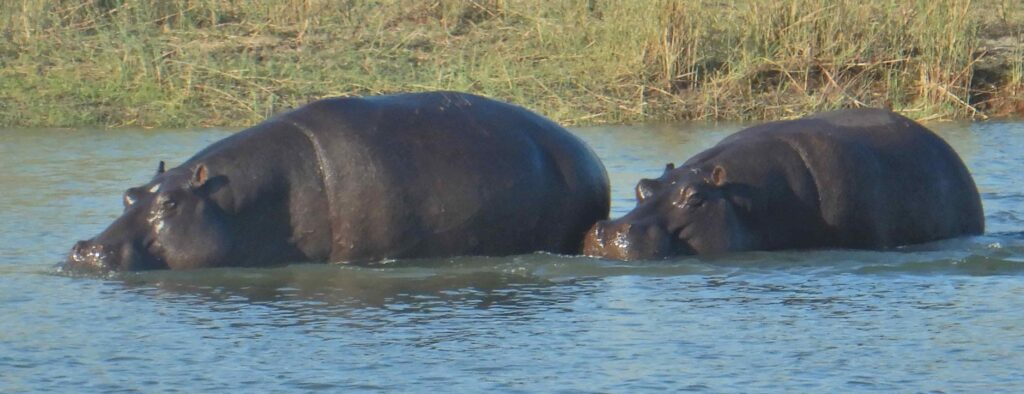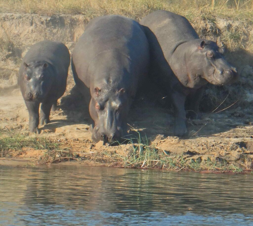Um 19:30 gehen wir zum Hauptgebäude und essen ein 3-Gänge Menue mit Kudu-Roulade als Hauptgericht, der Koch ist gut und das Essen Spitze. Danach sitzen wir noch für 3 Gin Tonic auf der Terrasse am Fluß, wo mittlerweilen ein Lagerfeuer brennt, und unterhalten uns mit anderen Gästen, dem Manager und Ralf dem Inhaber des Camps. Dazwischen kommt noch ein Flußpferd an Land und weidet neben der Rezeption. Als wir es uns ansehen wollen versteckt es sich hinter einem Baum. Also der Kopf ist hinter dem Baum und es sieht uns nicht mehr, deshalb scheint es wohl der Meinung zu sein, wir sehen es auch nicht, naja so sind Flußperde halt. Wieder ein sehr schöner Abend.
