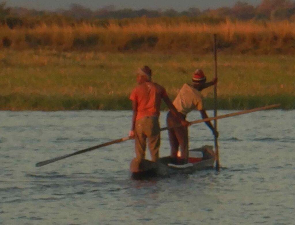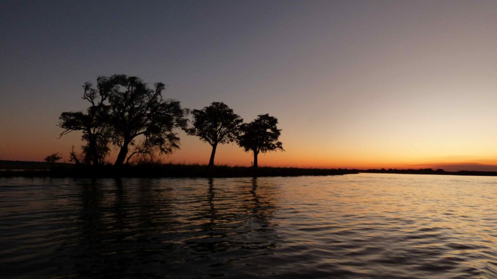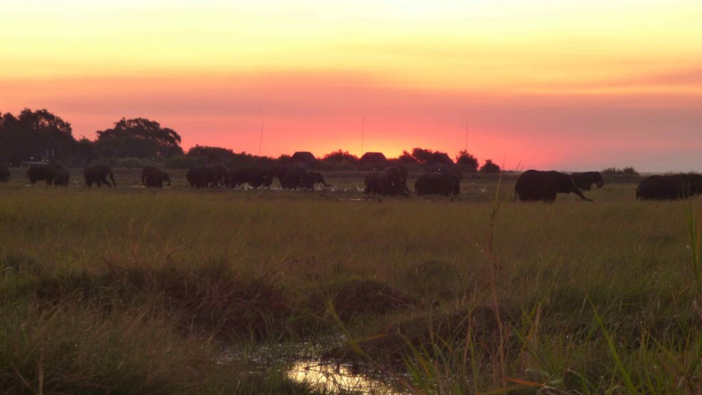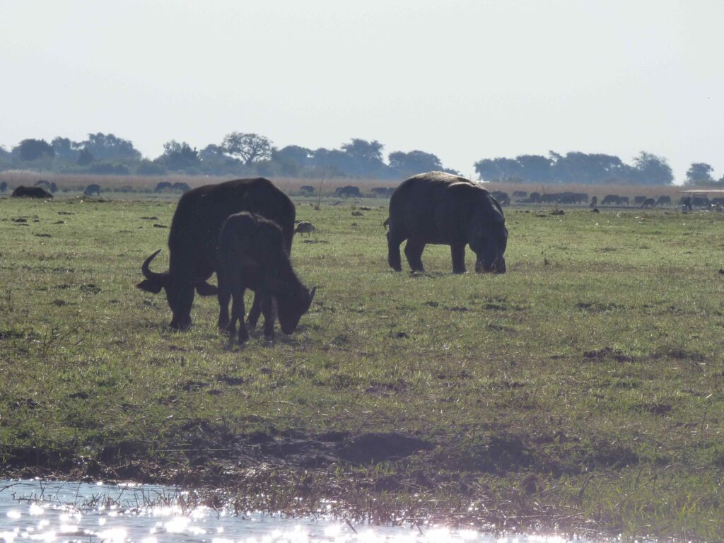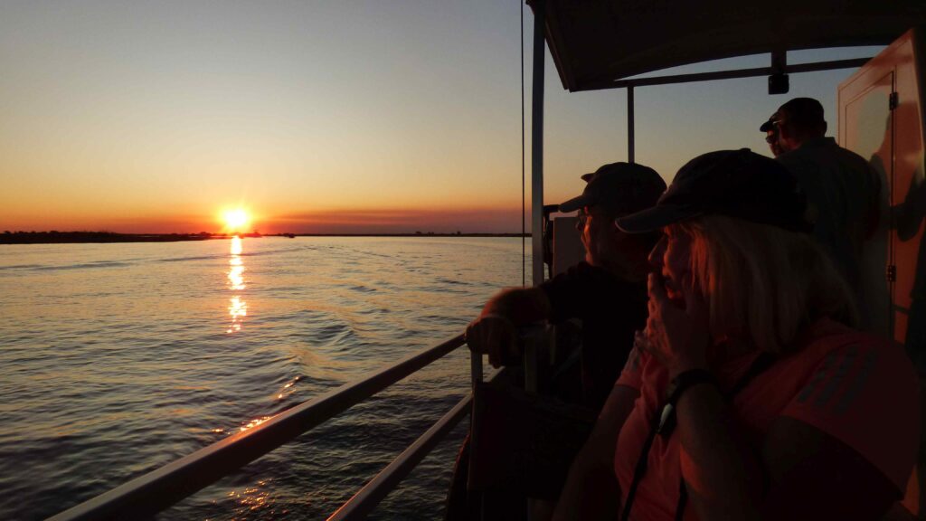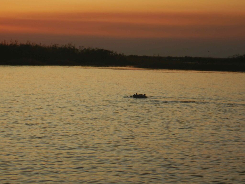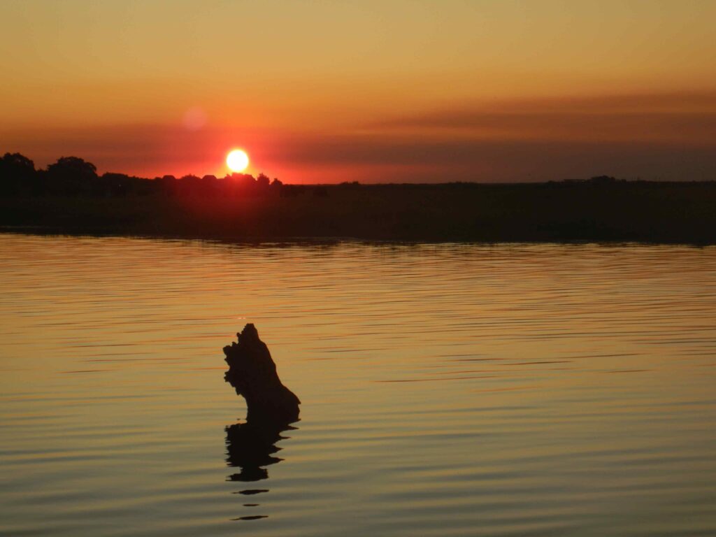 Um 15Uhr werden wir zu einer 3-stündigen Bootsfahrt auf dem Chobe abgeholt. Nach 10 Minuten Fahrt im Jeep steigen wir auf ein Boot um und der Fahrer wird zum Kapitän. Es geht auf dem Chobe River um eine Insel (Sedudu Island) im Fluß, welche als Naturschutzgebiet ausgewiesen ist. Auf der Insel und an den Ufern des Flußes gibt es jede Menge Vögel und Wildtiere. Elefanten, Büffel, Flußpferde und Krokodile sind ganz nahe und in großer Zahl vorhanden. Am Ende der Fahrt sehen wir mal wieder einen tollen Sonnenuntergang.