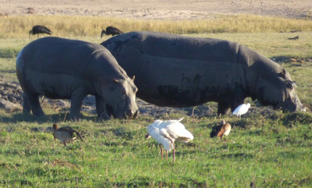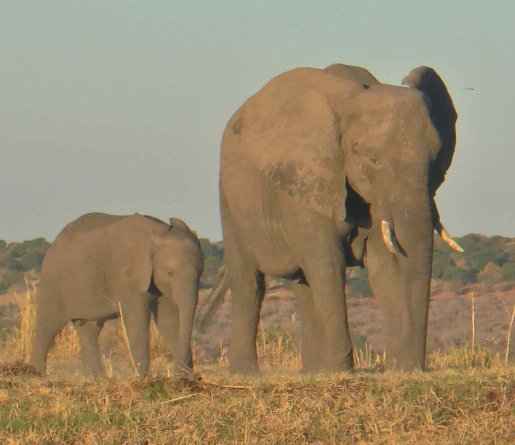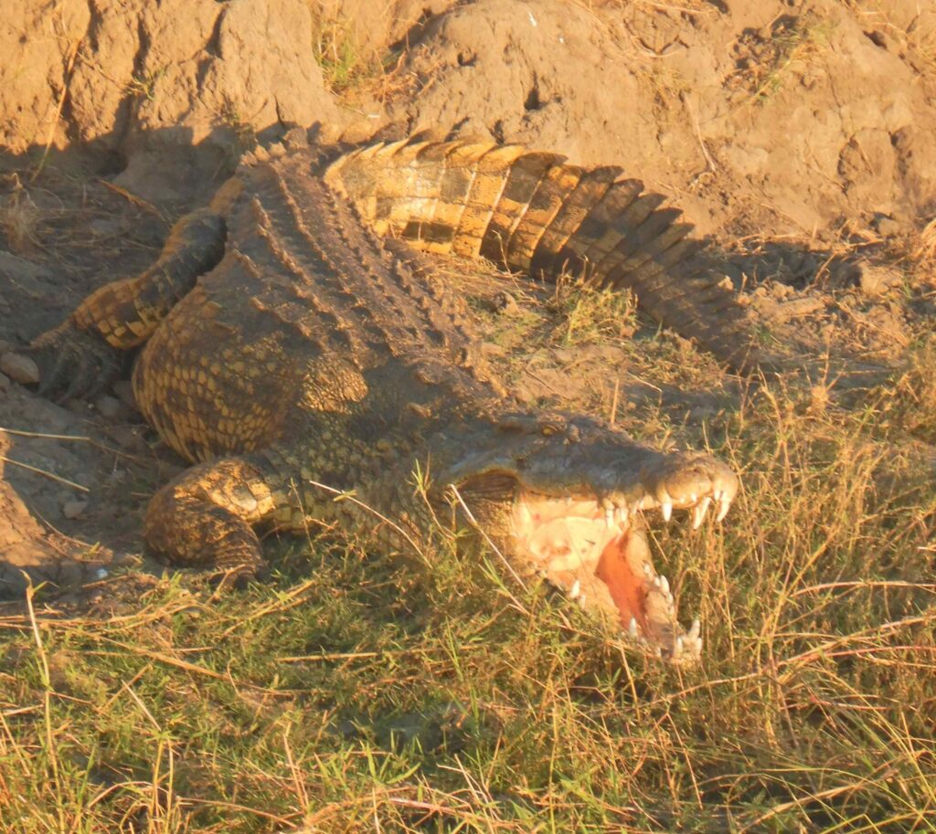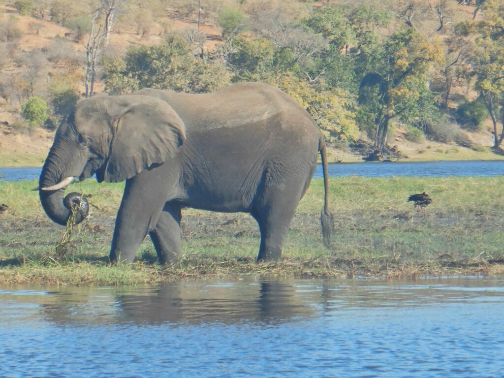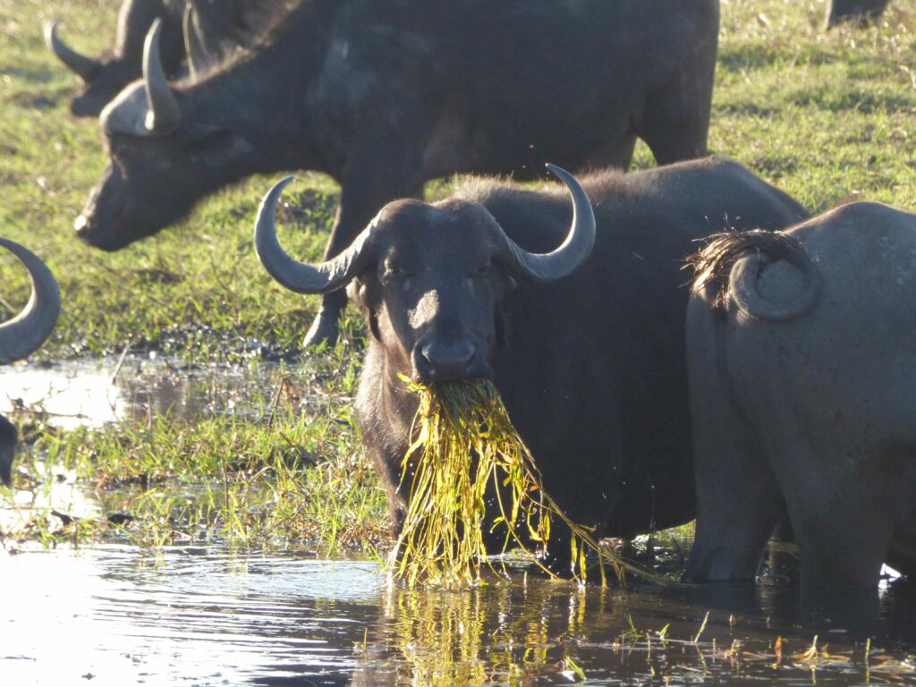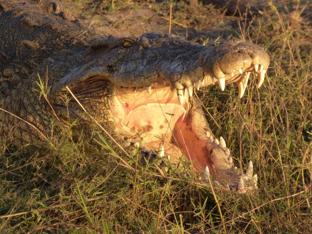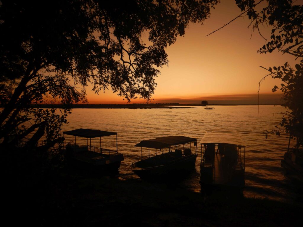 Um 15Uhr werden wir zu einer 3-stündigen Bootsfahrt auf dem Chobe abgeholt. Nach 10 Minuten Fahrt im Jeep steigen wir auf ein Boot um und der Fahrer wird zum Kapitän. Es geht auf dem Chobe River um eine Insel (Sedudu Island) im Fluß, welche als Naturschutzgebiet ausgewiesen ist. Auf der Insel und an den Ufern des Flußes gibt es jede Menge Vögel und Wildtiere. Elefanten, Büffel, Flußpferde und Krokodile sind ganz nahe und in großer Zahl vorhanden. Am Ende der Fahrt sehen wir mal wieder einen tollen Sonnenuntergang.