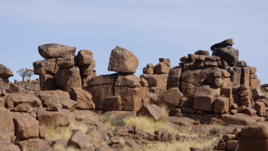 Dann fahren wir noch zum Giants Playground, hier liegen große Felsbrocken übereinander, als wenn Riesen damit gespielt hätten. Die Formationen sind wohl vulkanischen Ursprungs und das Gebiet ist deutlich grösser als der Köcherbaumwald.