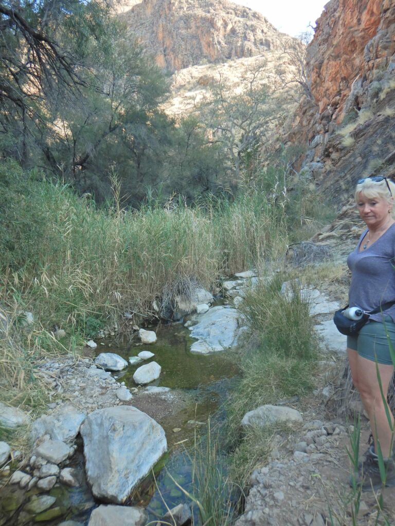 Die Nacht war ruhig, wir packen und wie fahren ohne zu frühstücken direkt zur Rezeption hoch. Beim Abfahren sehen wir schon die ersten 4 Affen den Müll der Reisegruppe zerfledern, ein ruhiges Frühstück wäre sicherlich nicht möglich gewesen. An der Rezeption stellen wir unser Auto ab und gehen nochmal auf den Waterkloof-Trail bis zu den ersten Pools. Es fließt tatsächlich ein kleiner Bach der sich stellenweise zu kleinen Tümpeln erweitert, in denen Frösch und kleine Fische zu sehen sind.