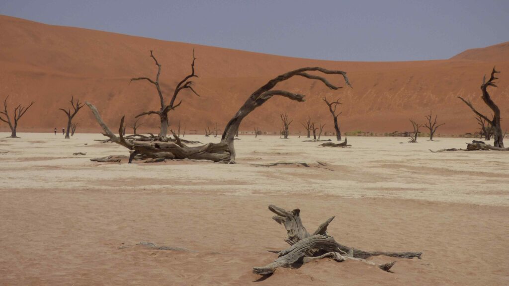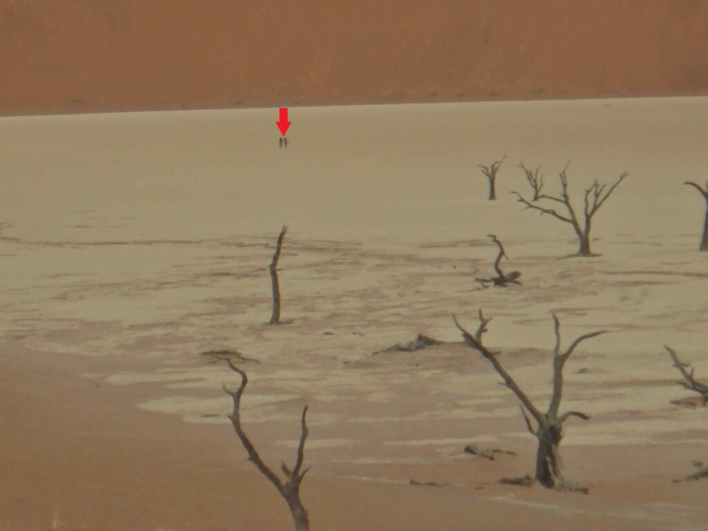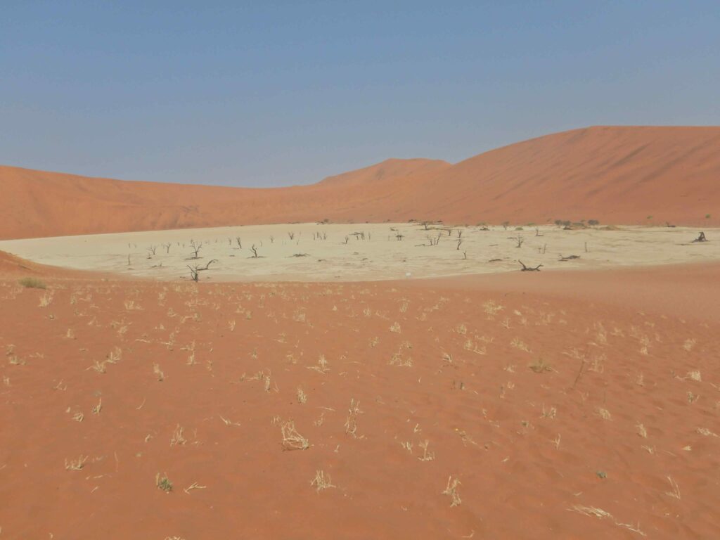 Wieder müssen wir eine Gebühr für den Park bezahlen, das Ticket vom Naukluft-Park gilt hier nicht mehr. Der eigentliche Campingplatz ist tatsächlich ausgebucht, aber es gibt noch eine „Overflow“-Bereich wo wir einen Platz bekommen. Nach dem dies nun alles geklärt ist und wir uns noch mit Hamburgern gestärkt haben, fahren wir die ca. 60km im Park nach Sossuvlie. Das meiste ist Teerstraße, nur die letzten 4,5km ist zum Teil tiefsandige Piste, die wir jedoch in bekannter Manier mit 2 Wheeldrive und viel Gas locker bewältigen. Dabei erweist sich unser Allround-Reifendruck von 1,9bar als vollkommen ausreichend, Luftdruck reduzieren (was einem alle dringend anraten) und wieder auffüllen können wir uns sparen. Am Parkplatz angekommen gehen wir zuerst die ca. 1,5km zum Deadvlie, einer Salzpfanne mit abgestorbenen Bäumen. Die Fläche ist richtig groß, aber genau wie in den Sanddünen, ohne Bezugspunkte nicht abzuschätzen und es gibt auch Leben in den Sanddünen drum herum. Auf Grund der vorgeschrittenen Tageszeit sind wir auch fast alleine da.
