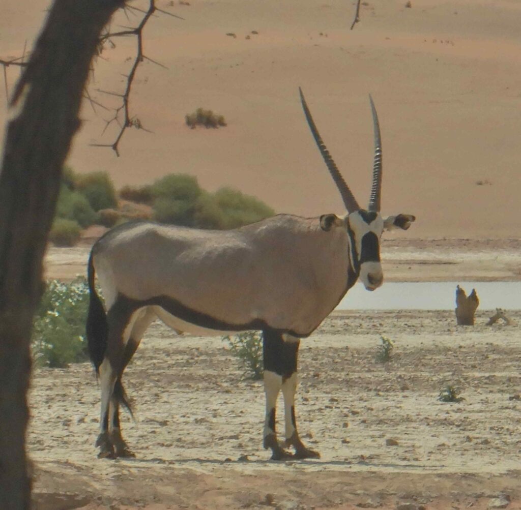 Zurück am Parkplatz fahren wir die wenigen hundert Meter zum Sossusvlie, einer Salzpfanne ohne Bäume die sich selten mit Wasser füllt. Als wir dort ankommen sehen wir zuerst eine Qryx-Antilope die aus der Salzpfanne kommt und gemütlich an uns vorbei läuft.