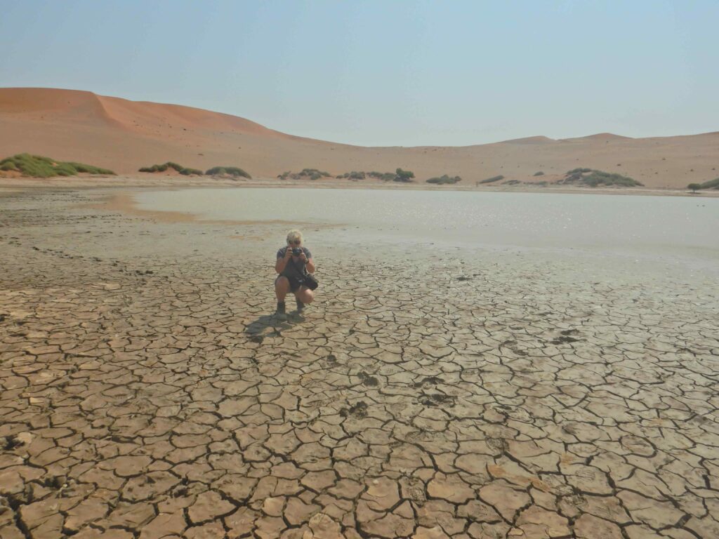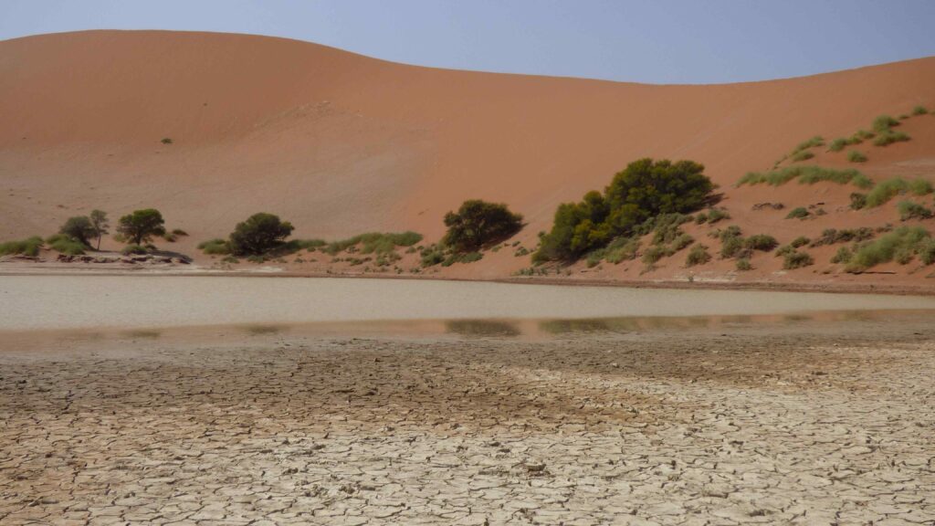 Die Fläche vor uns spiegelt in der Sonne wie Wasser, eine der hier typischen Fatamorgana. Als wir jedoch davorstehen hat sich die Fatamorgana tatsächlich in einen See verwandelt. Wir haben das seltene Glück, dass der Sossusvlie zum Teil unter Wasser steht. Die Wüste hält halt immer Überraschungen bereit, keine 2 Kilometer auseinander tote Salzpfanne und lebenspendenden See.
