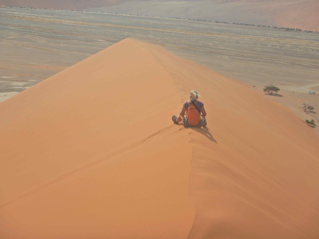 Nach dieser nicht zu anstrengenden Exkursion fahren wir natürlich in 2 Wheeldrive wieder durch den Sand zurück zur Teerstraße und dort bis zur Düne 45 (benannt nach dem Straßenkilometer 45) direkt an der Straße. Da müssen wir natürlich noch rauf, wir haben uns ja heute noch nicht gequält. Wir umrunden die Düne und besteigen sie von der Rückseite, da gibt es eine Fläche mit Grasbüscheln und der Sand ist dort fester. Die letzten paar Meter bis zur Kante sind steil und es geht nur mit allen Vieren vorwärts, doch dann sind wir oben. Man hat mal wieder einen grandiosen Ausblick auf Berge, Dünen und Ebenen, leider sind diese Impressionen nicht auf Bilder zu bannen.