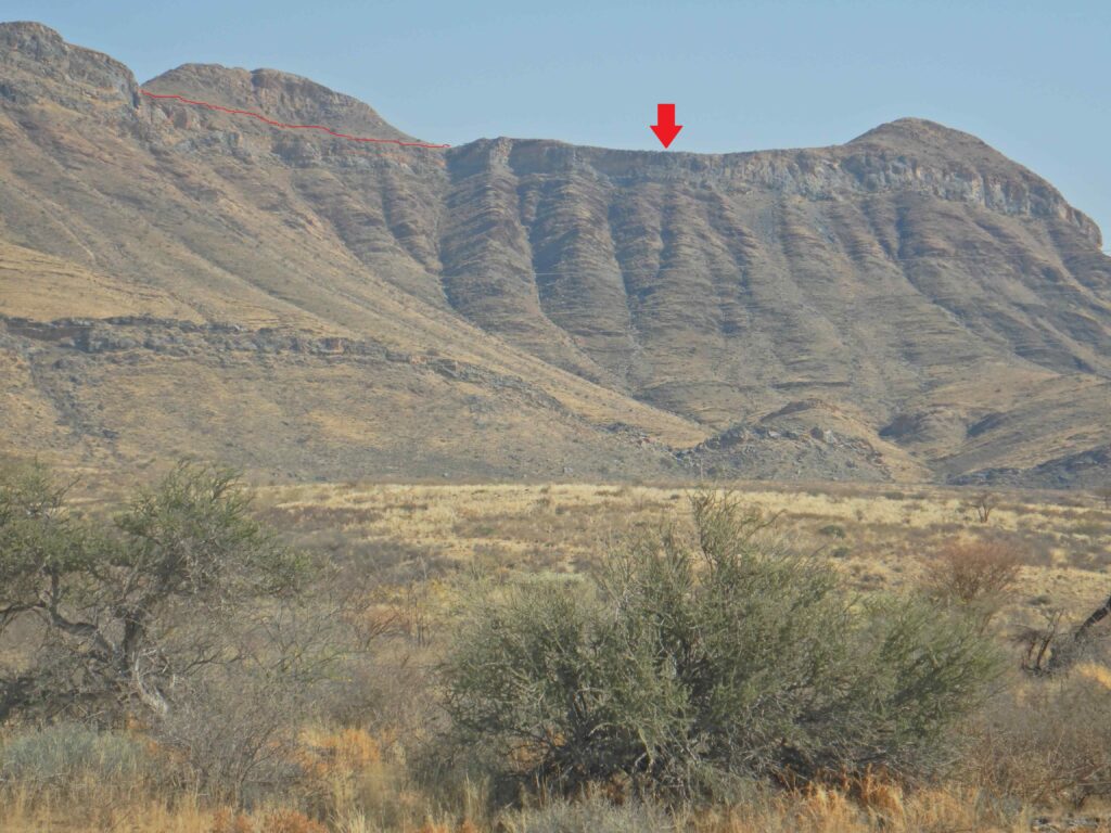 Nach einer Stunde sind wir wieder zurück am Auto und trinken an der Rezeption noch etwas, bevor wir nach Sesriem fahren. Nach ca. 20km erreichen wir die Stelle, auf die wir am Vortag herabgesehen haben. Oben auf der Klippe haben wir gestanden (roter Pfeil) und dann den Berg links auf einem Bergzebrapfad umrundet (rote Linie).