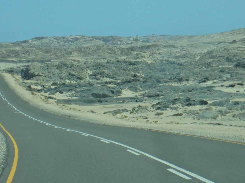 Die kleine Stadt liegt zwischen Wüste, Mondlandschaft und Meer, es weht ein starker Wind und treibt den Sand über die Straße und Bahnlinie. Die Gleise sind wohl an einer Stelle unter Sand begraben, da sind Arbeiter zu Gange, die Straße ist aber frei.