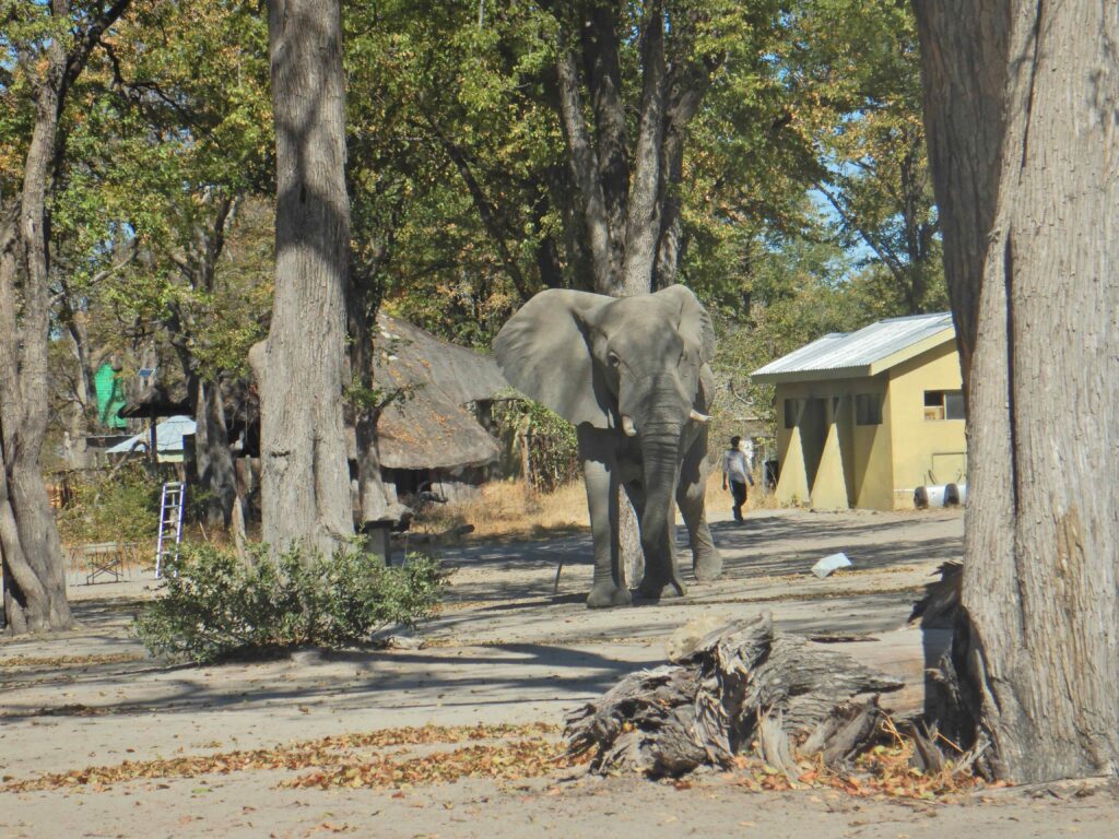 Wir fühlen uns nicht wohl wegen des trostlosen staubigen Platzes und auch der Elefanten. An der Check in-Hütte erfragen wir das WLAN Password und rufen per What’s App unsere Reiseleitung an, obwohl es Sonntag ist. Sie kontaktiert unsere nächste Unterkunft in Maun, wir können zwei Tage eher kommen. Also packen wir ein und fahren erleichtert noch knapp 100km bis ins Crocodile Camp nach Maun. Hier ist es wesentlich besser, mit Restaurant, Bar und Terrasse am Fluss, was wir auch ausgiebig nutzen.